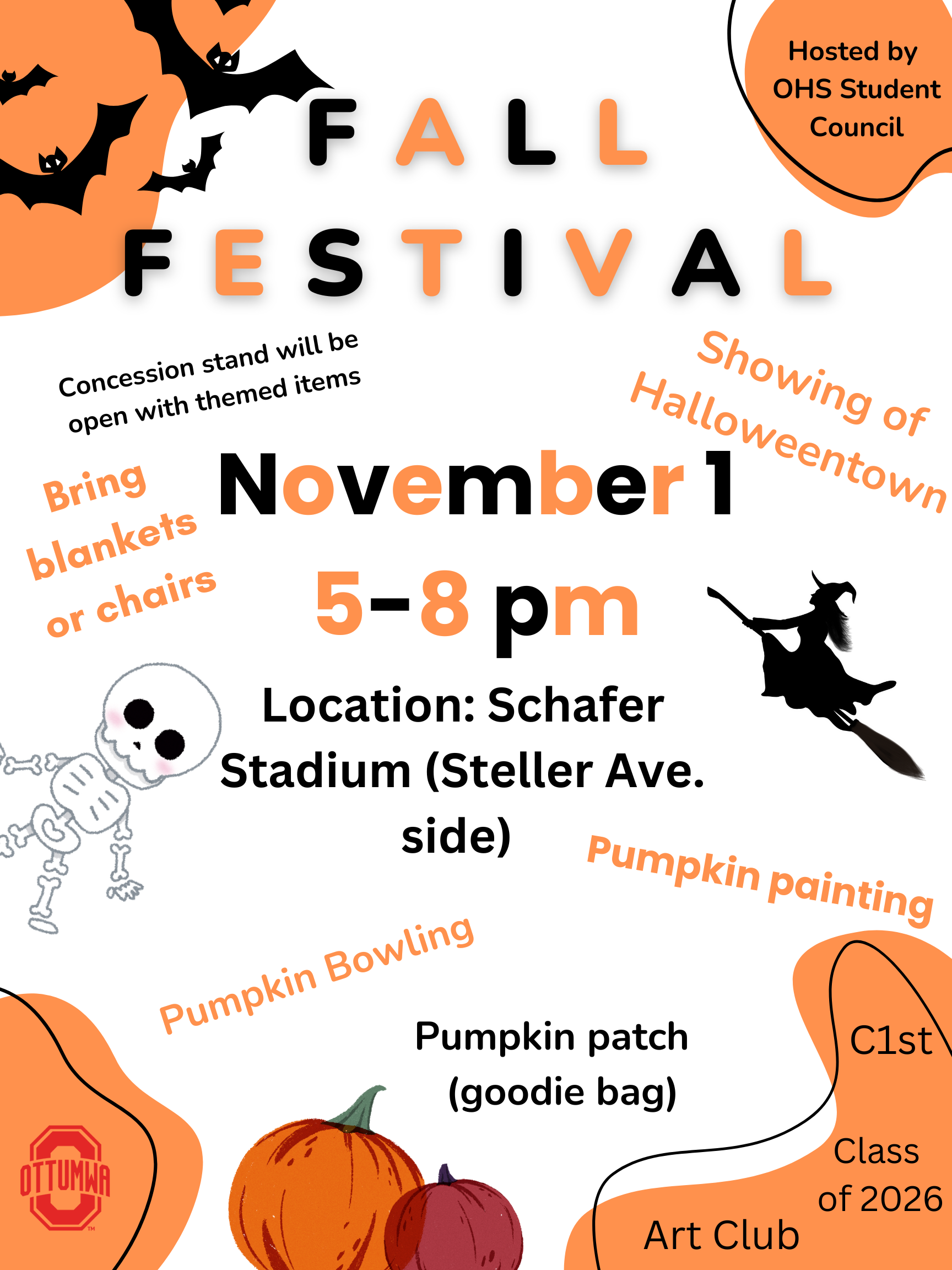 The Ottumwa High School Student Council is hosting a Fall Festival on Friday, November 1, 2024, at Schafer Stadium in Ottumwa. The student-led festival will host a concessions stand with themed items, a showing of Halloweentown, pumpkin bowling, pumpkin painting, a pumpkin patch (goodies bag), and more! Ghouls, both young and old, are welcome between 5:00 and 8:00 pm at the Steller Avenue side of Shafer Stadium and are invited to bring blankets or chairs. The event is sponsored by the Ottumwa High School Student Council, C1st Credit Union, Class of 2026, and Art Club.